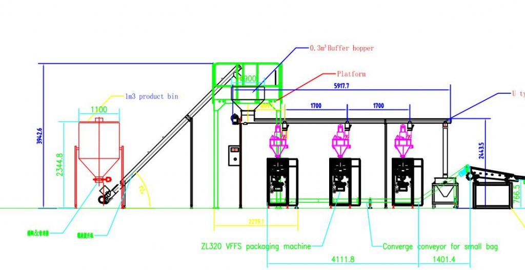 1, सॅमॅल बॅग फॉर्मिंग फिलिंग पॅकेजिंग मशीन .हा भाग कच्चा माल हॉपर, इनलाइन स्क्रू फीडिंग मशीनसह .मिडल बफर हॉपर, आणि क्षैतिज फीडिंग स्क्रू सर्व कच्चा माल 6 सेटमध्ये पाठवण्यासाठी ऑगर मेजरिंग मशीन