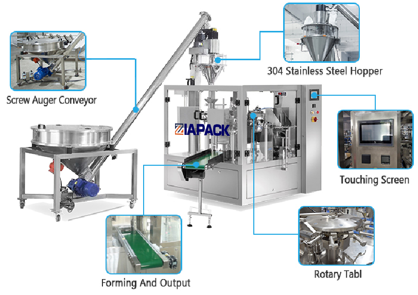 विविध पावडर सामग्री पॅक करण्यासाठी प्री-मेड बॅगसाठी स्वयंचलित रोटरी प्रकार पॅकेजिंग मशीन.